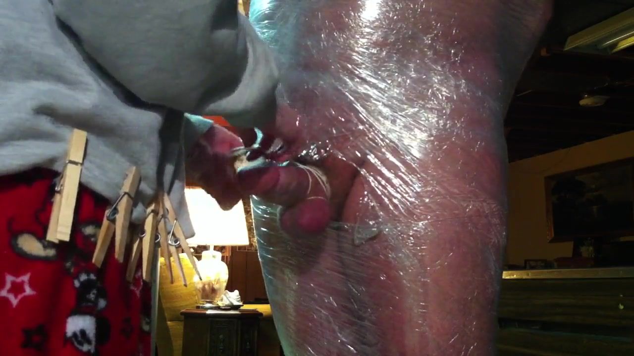 plastic wrapped freak gets a handjob from gloria